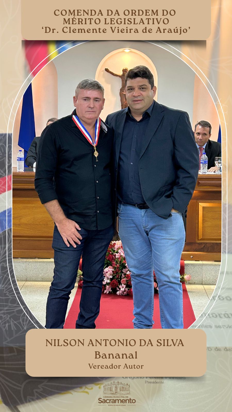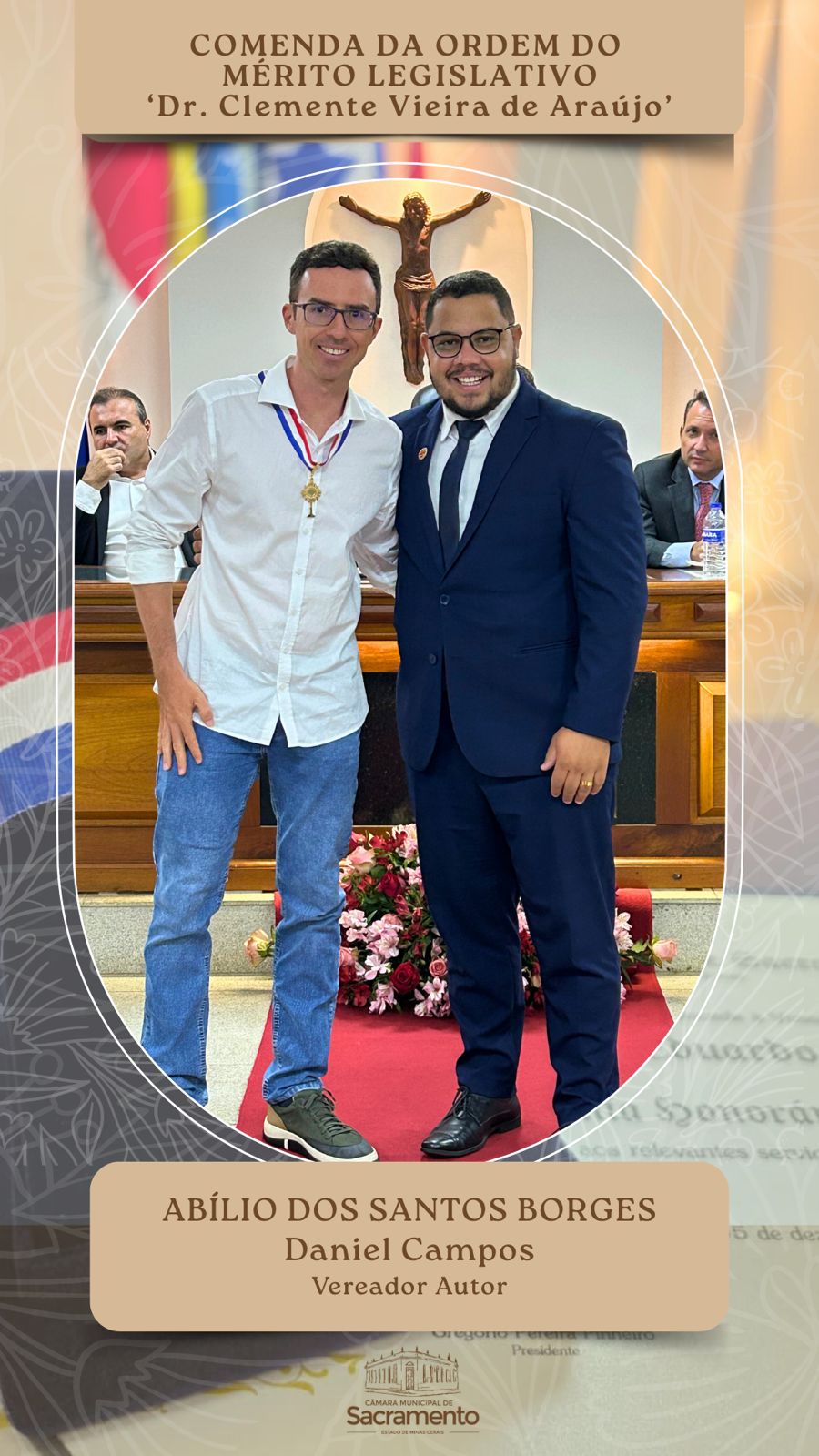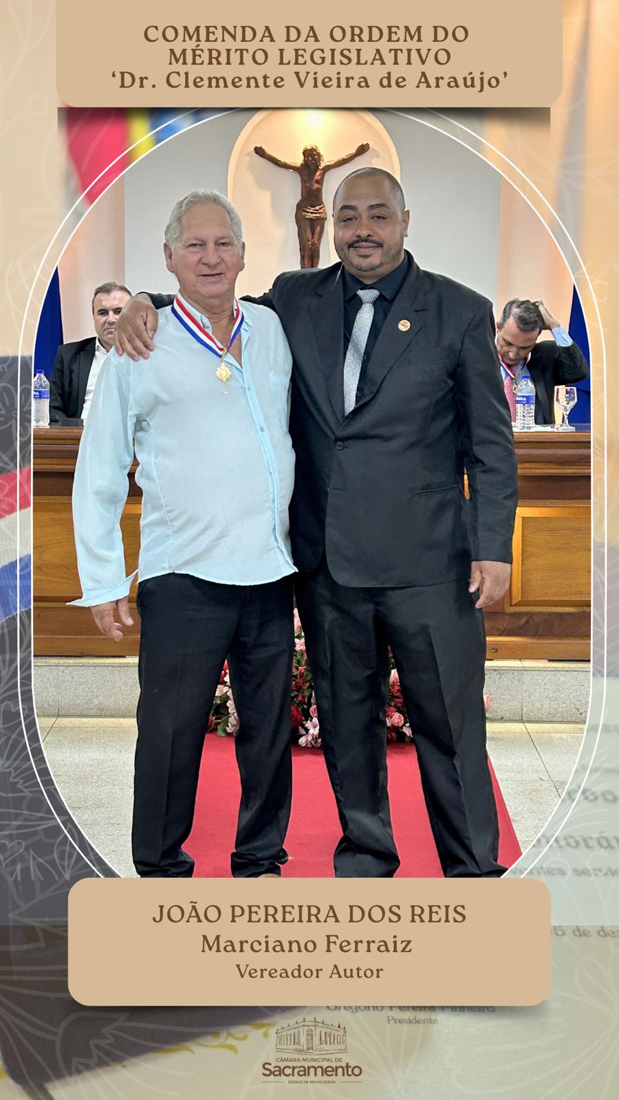 A Câmara Municipal de Sacramento realizou, nesta quinta-feira, 11 de dezembro, a Sessão Solene de outorga do Título de Cidadania Honorária de Sacramento e da Comenda da Ordem do Mérito Legislativo “Dr. Clemente Vieira de Araújo”. Estiveram presentes os vereadores da Casa; prefeito Osmar Trevisan Júnior; deputado estadual Arnaldo Silva Jr., um dos condecorados com a honraria maior da noite; representantes do Poder Judiciário; homenageados e seus familiares; e demais cidadãos.
